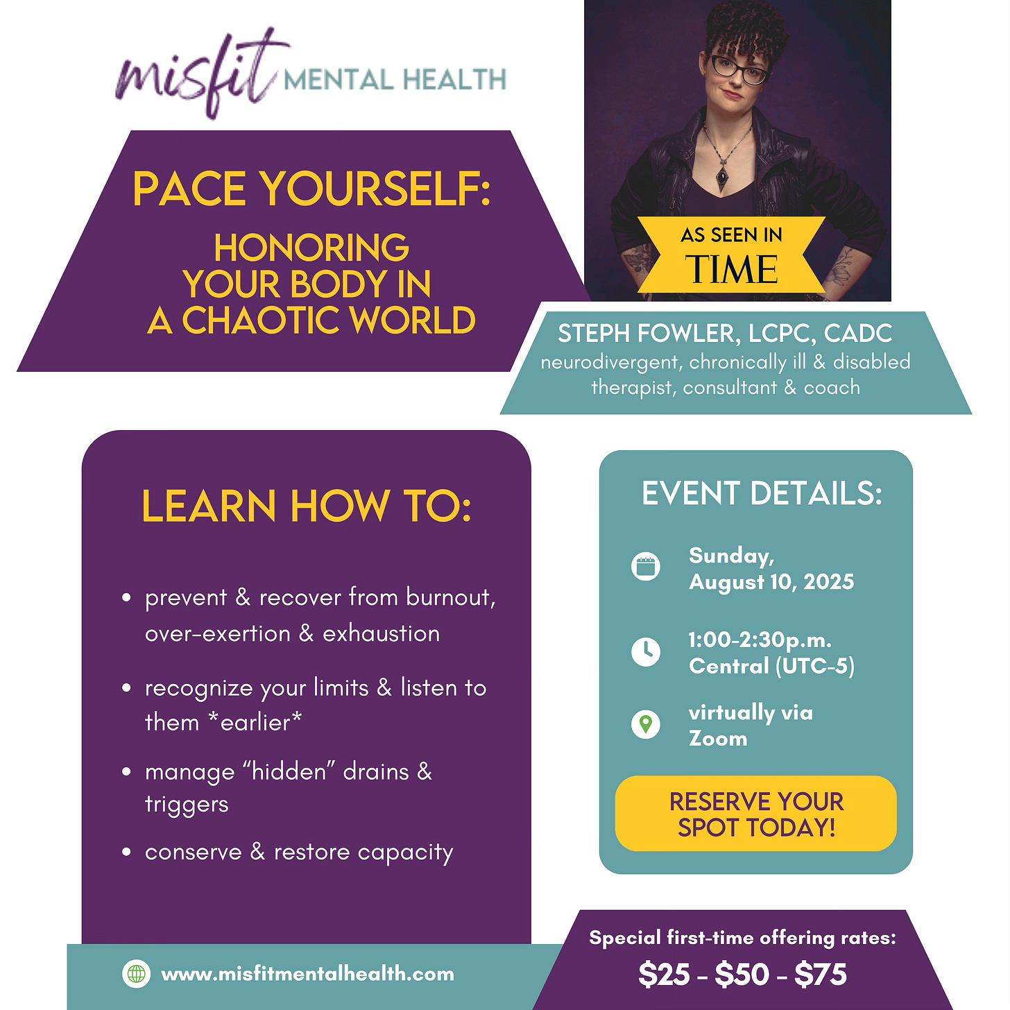 If daily life has felt like a lot, if you've been feeling drained and looking for a more sustainable way to manage everything on your plate, this may be for you! In two weeks, on Sunday, August 10 at 1pm Central (U.S), I'll be running this 90-minute workshop for folks to come learn more about how to pace themselves better, with short reflection prompts and time for participants to start developing a better pacing plan moving forward. Anyone is welcome to attend (no stipulations on location like with therapy) and the workshop will be held on Zoom.